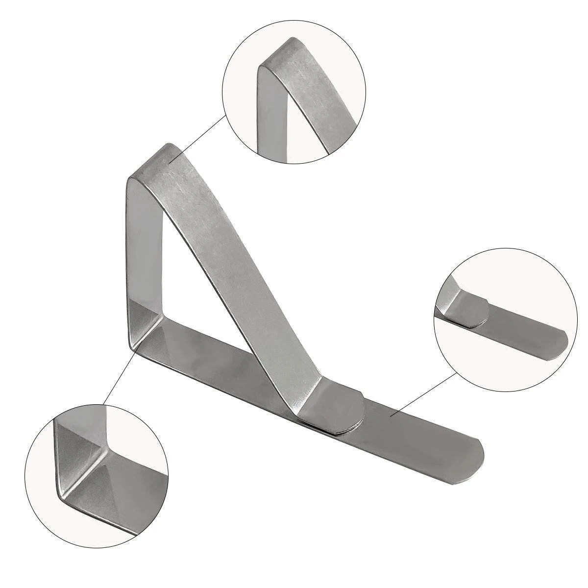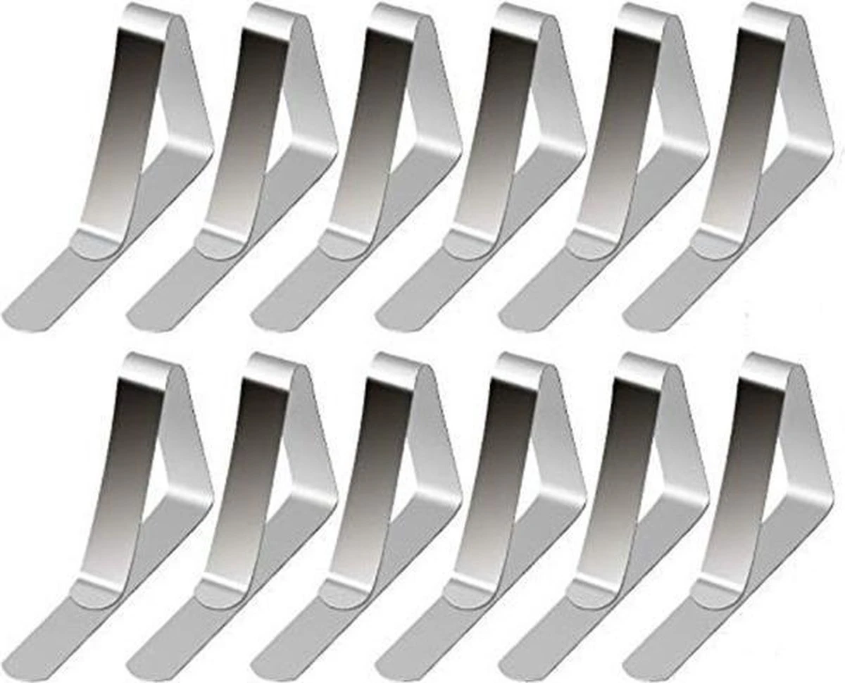 Bent u op zoek naar de ideale tafelkleedklemmen voor uw tafel met een tafelblad tot 3,5cm dikte dan bent u bij ons aan het juiste adres, onze klemmen hebben een extra lange kant zodat ze nog beter om de tafel klemmen en het tafelkleed beter op zijn plek kan houden. Doordat de klemmen uit een stuk RVS zijn gemaakt zijn de klemmetjes steviger en gaan minder snel kapot. Deze set bestaat uit 12 tafelklemmen waardoor u meerdere tafels kan voorzien van deze tafelkleedhouders.