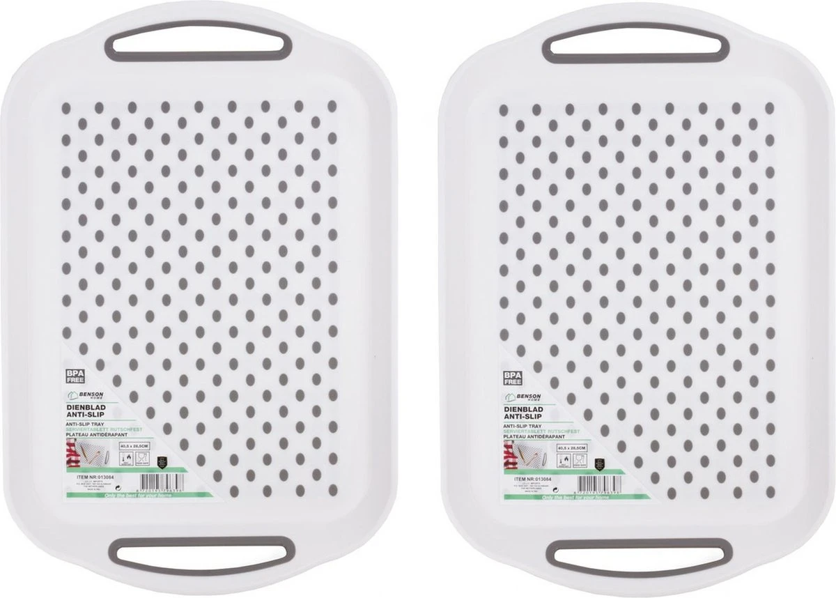 2x stuks benson dienbladen/serveerbladen antislip rechthoekig wit 40 x 28 cm. Dit serveerblad beschikt over handvaten en antislip nopjes voor het eenvoudig vervoeren van etenswaar zonder te morsen. Makkelijk schoon te maken met een vochtige doek. Afmeting: 40 x 28 cm. Materiaal: kunststof.