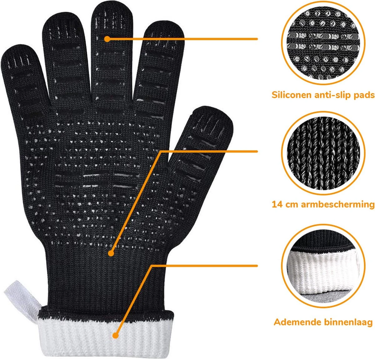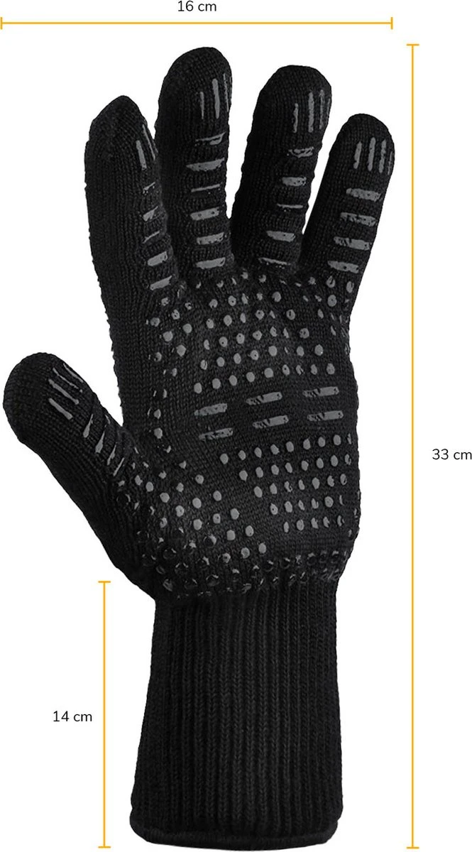 Met een totale lengte van 33 centimeter beschermen de ovenhandschoenen naast je handen ook je polsen en armen tegen de hoge temperaturen. Wel zo fijn natuurlijk wanneer je diep in een oven reikt, tijdens het barbecueën de grill vastpakt of een stuk hout in de vuurkorf verplaatst!