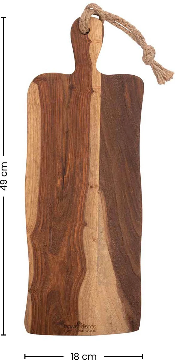 Ben jij op zoek naar een unieke serveerplank? Met de robuuste vorm en het mooie handvat is de Pure Rose Wood serveerplank van Bowls and Dishes een echte eyecatcher! Hij is gemaakt van Rose Wood Hout en elke plank is uniek door de prachtige tekening van het lichte en donkere gevlamde hout. Het oppervlak van de plank is niet altijd helemaal vlak, maar natuurlijk gevormd.