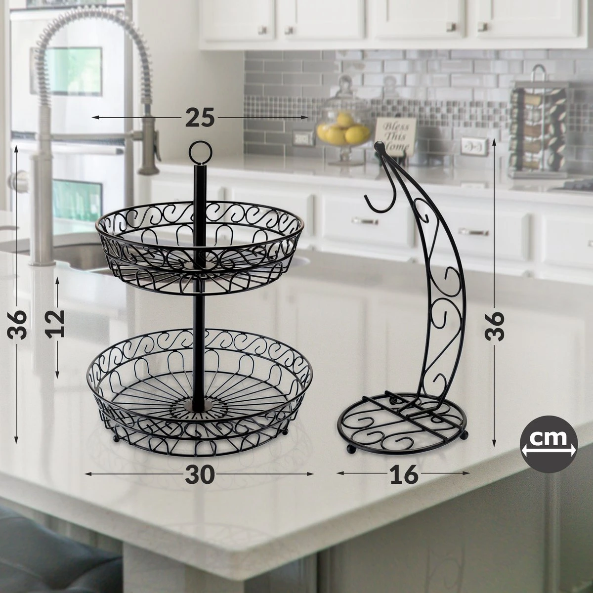 Extra veel ruimte voor het bewaren van bananen, ander fruit en groentes met de Chefarone fruit etagère met maar liefst 2 verdiepingen inclusief bananenhouder! De decoratieve blikkenvanger is de ideale fruitschaal en veelzijdig inzetbaar. Naast groente en fruit is de opberger ideaal te gebruiken voor tijdens het ontbijt of de lunch om die heerlijke verse broodjes in te leggen. Creëer jouw eigen stijl en kies voor een combinatie van vintage en klassiek! De fruitschaal en bananenhouder zijn gemaakt uit robuust zwart staal voor stabiliteit tijdens en na het vullen.