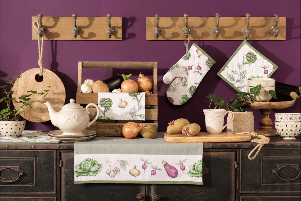 Een serie die een vleugje nostalgie toevoegt. De prachtig geïllustreerde verschillende soorten groenten doen je denken aan de moestuin. De matchende offwhite achtergrond versterkt de gedetailleerde vormgeving en kleuren van de groenten. Ook het groene patroon is een ontzettend fijne toevoeging aan deze collectie. Zowel voor de keuken als op tafel zijn er voldoende artikelen verkrijgbaar die zorgen voor een sfeervolle (leef)keuken. Denk hierbij aan keukenschorten, tafelkleden, keukendoeken, ovenhandschoenen, pannenlappen en broodmandjes.
