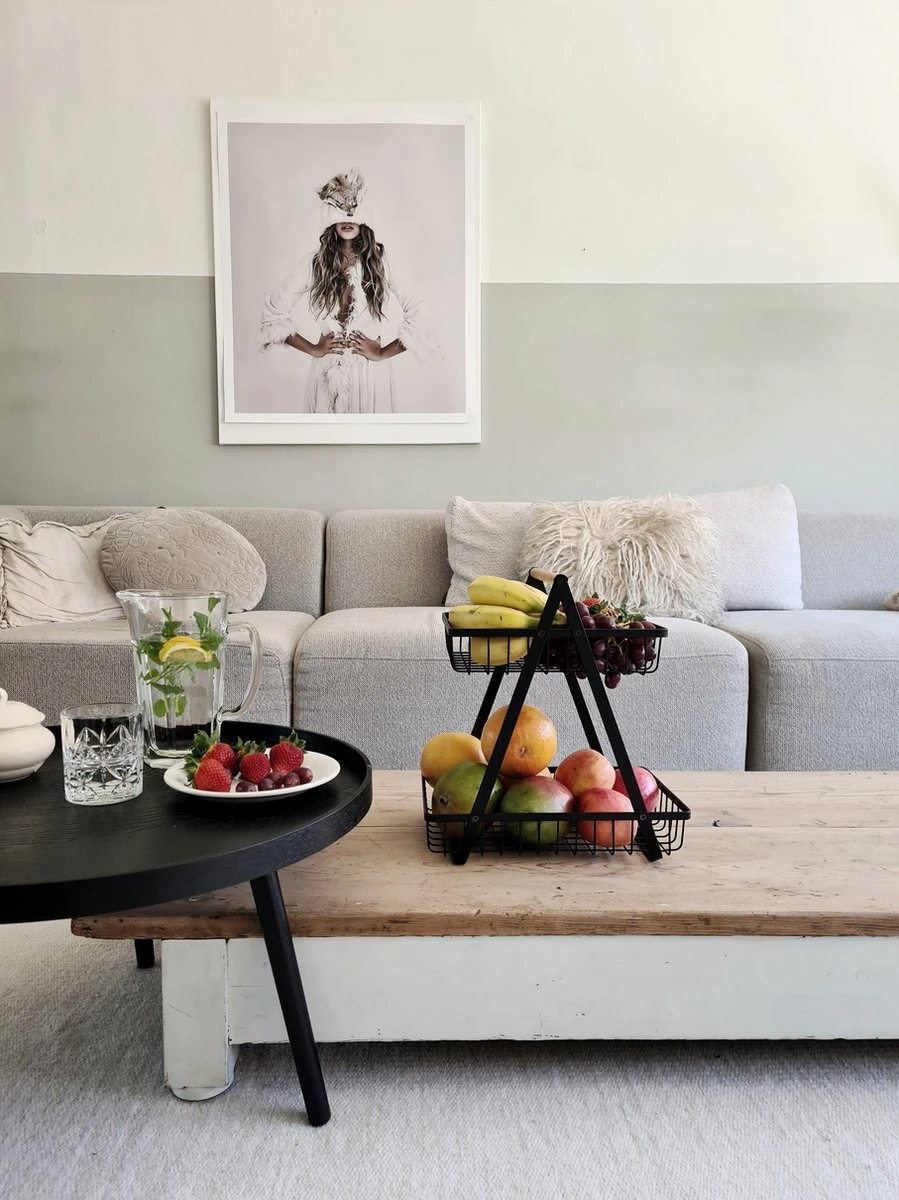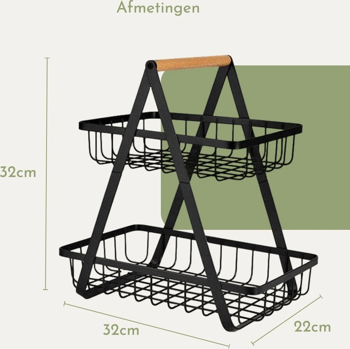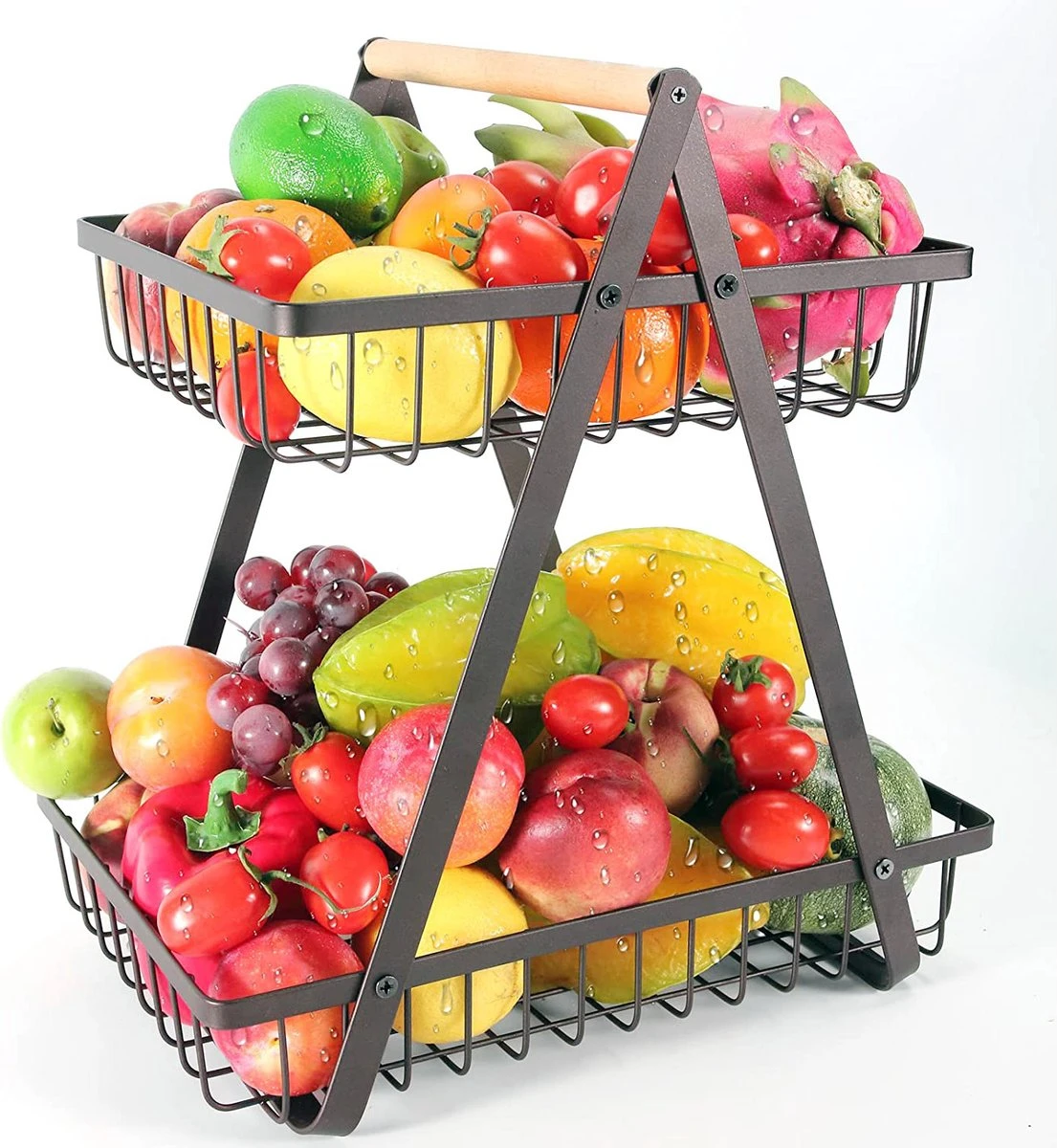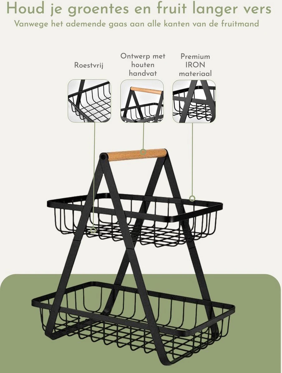 Door het 2 lagen etagère-ontwerp bespaar je veel ruimte in je keuken. De twee ruime manden zijn daarnaast elk afneembaar zodat je ze ook afzonderlijk van elkaar kunt gebruiken. Handig voor als je al je fruit of groente in een keer mee wilt nemen!