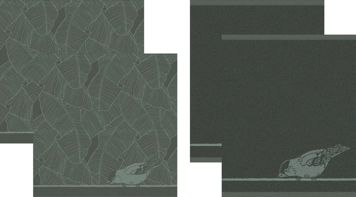 Het huismusje van DDDDD staat nieuwsgierig te kijken op de border van de thee-en keukendoek Birdy. Het dessin heeft een all-over print van bladeren waarmee je een fijne, botanische stijl creëert in de keuken.