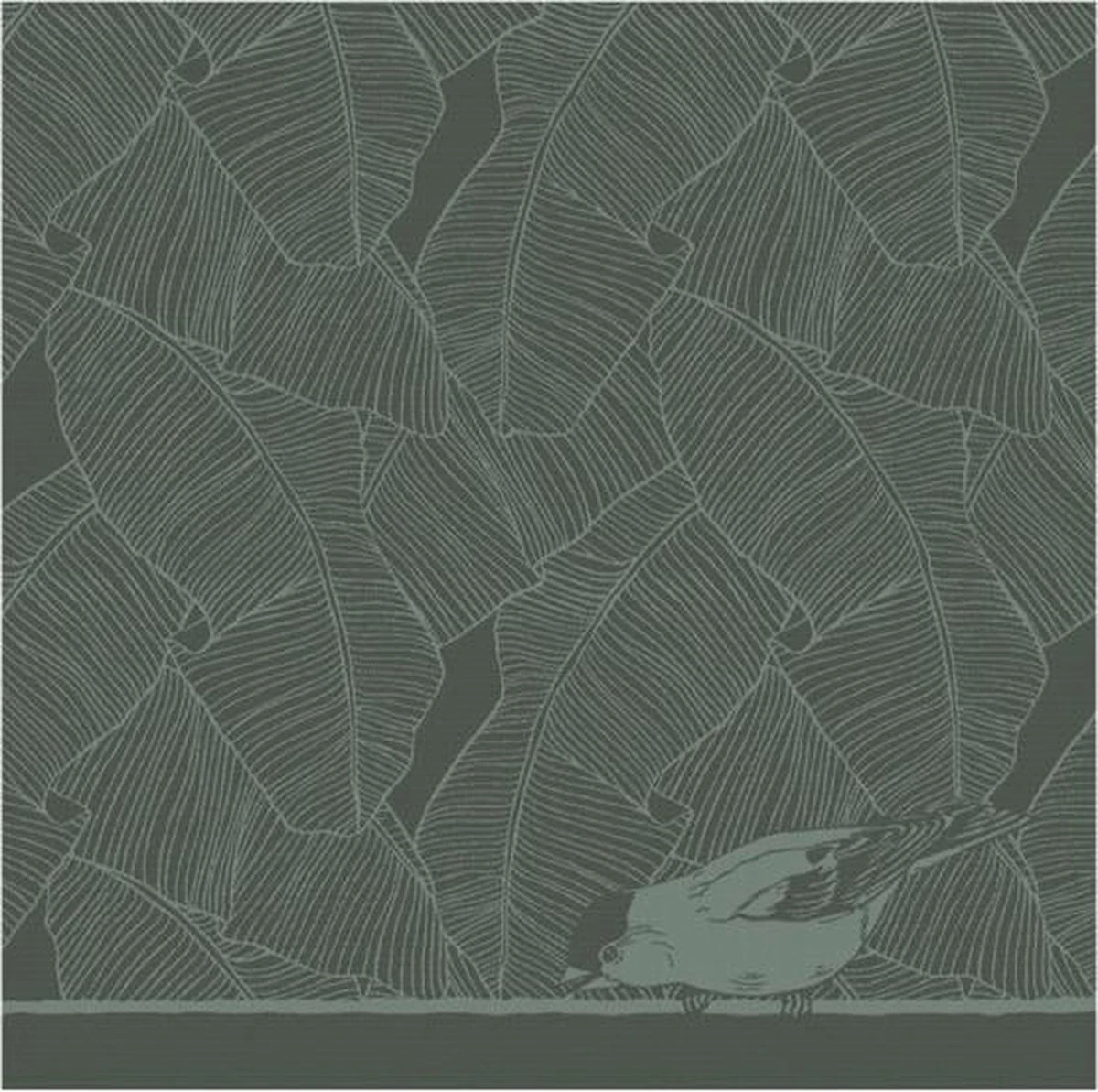 Het huismusje van DDDDD staat nieuwsgierig te kijken op de border van de thee-en keukendoek Birdy. Het dessin heeft een all-over print van bladeren waarmee je een fijne, botanische stijl creëert in de keuken.