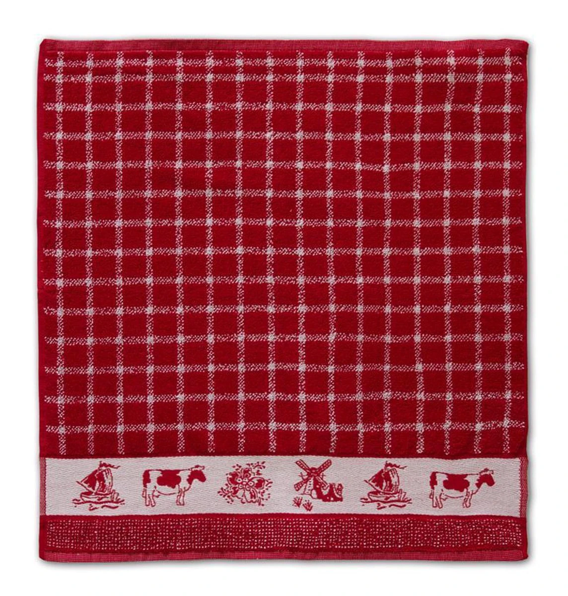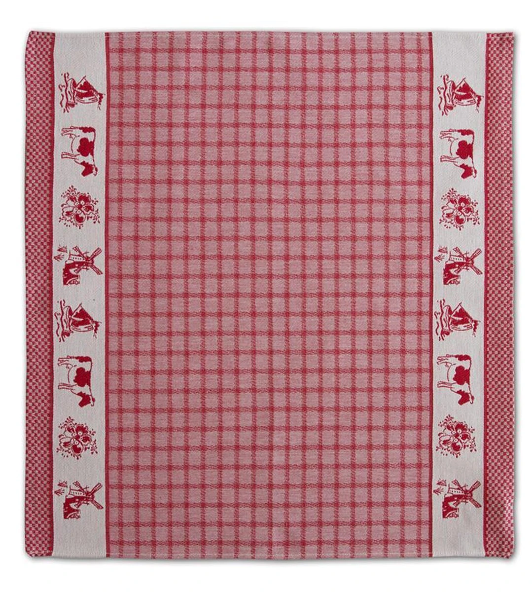 Molens, koetjes en boten. Het dessin Dutchie van DDDDD bestaat uit oer-Hollandse afbeeldingen in de border op een traditioneel rood geruite doek.