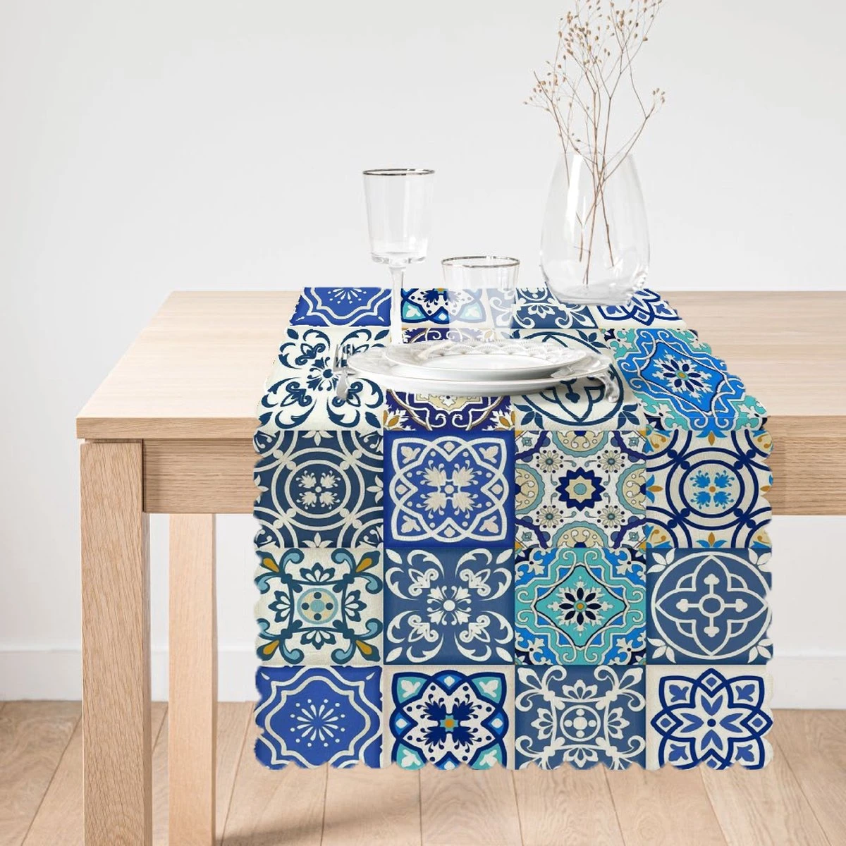 De Groen Home Bedrukt Velvet Textiel Tafelloper – Blauwe Mandala – Fluweel – Runner 45×135