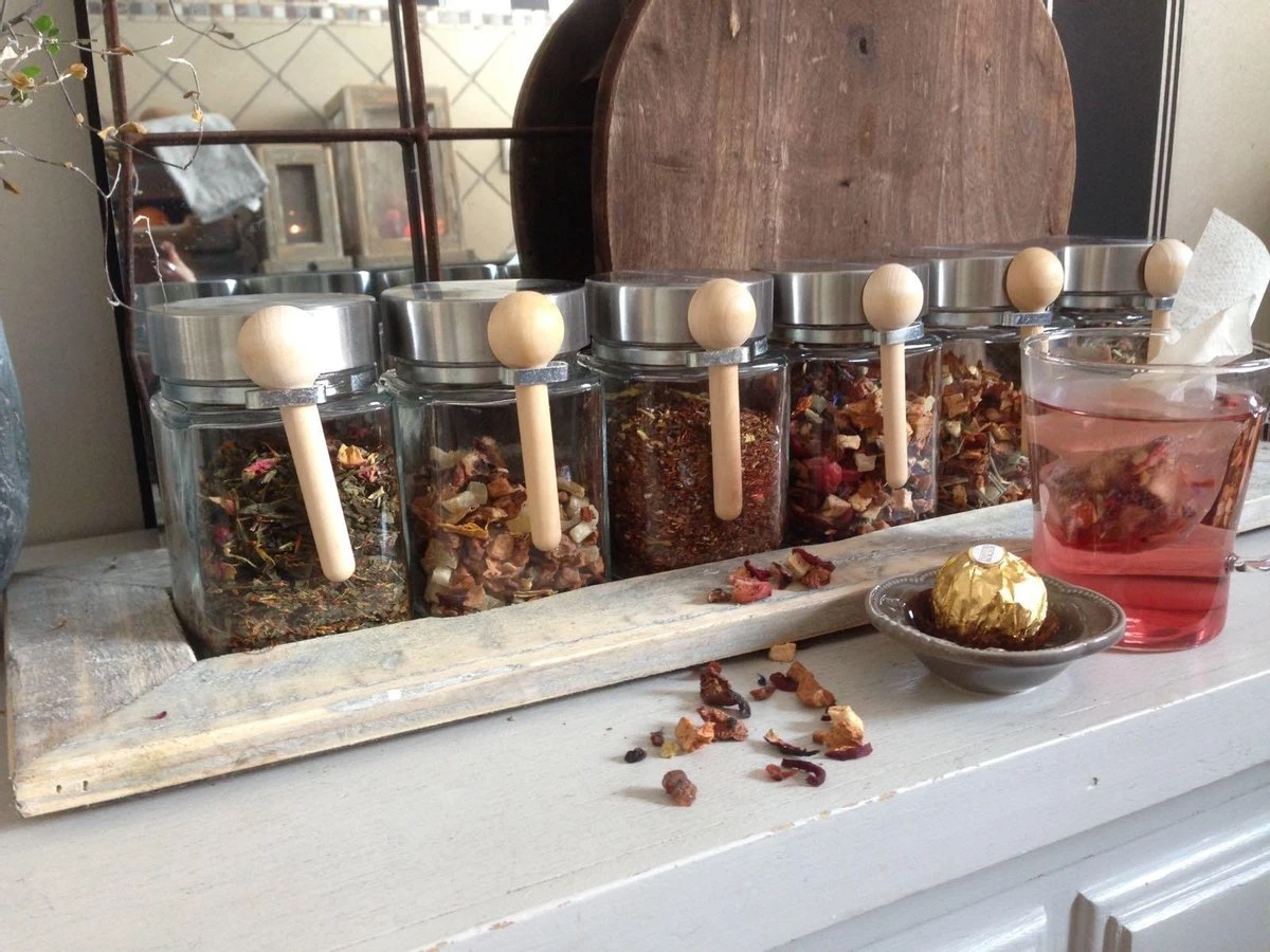Gezellig een kopje thee drinken? Mooi dienblad van steigerhout met 6 glazen potjes voor bijvoorbeeld losse thee en verschillende soorten suiker. De potjes hebben een RVS dekseltje en een houten lepeltje erbij. Hiermee kan een ieder z’n eigen smaakje thee maken.