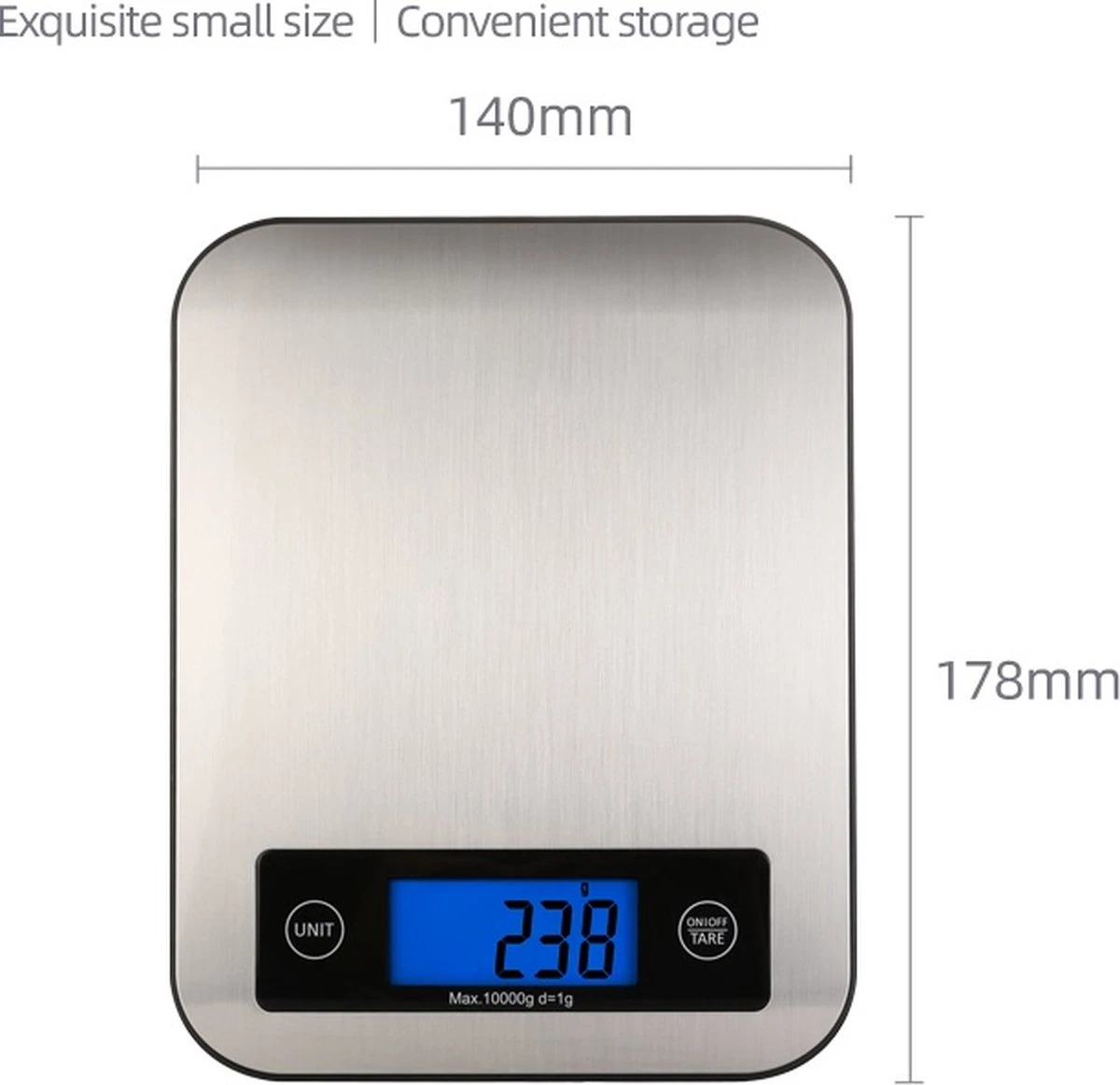 Het moderne en stijlvolle design van deze keukenweegschaal is een aanwinst voor iedere keuken. Met deze handige keukenweegschaal kun je alles tussen de 1 en 10000 gram zeer precies afwegen. Dankzij het blauw verlichte display is het gewicht gemakkelijk af te lezen. De weegschaal is door het gladde materiaal goed schoon te houden.