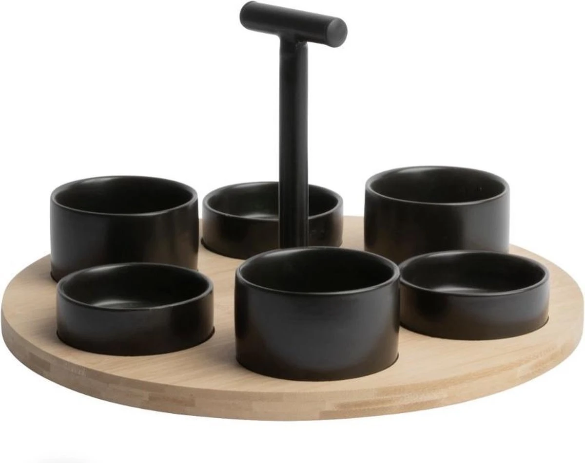 De serveerplank kun je eenvoudig ronddraaien. Het Plateau heeft uitsparingen waar de bakjes stevig in blijven staan.