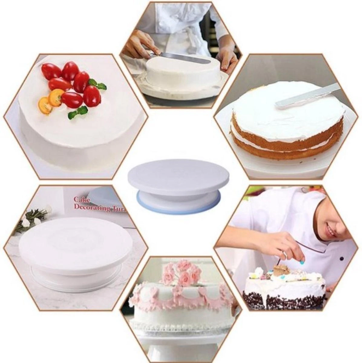 Het taartplateau draait soepel, zodat je beide handen vrij hebt voor de decoratie van je taart. Door de anti-slip laag aan de onderkant zal het plateau niet verschuiven. Tevens staan er lijnen op het plateau waarmee je de juiste taartomvang kunt bepalen. Het taartplateau is ook geschikt om het eindresultaat op te presenteren.