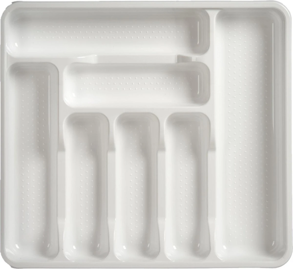 Bestekbak/bestekhouder 7-vaks wit. Formaat: 42 x 39 x 4,5 cm. Materiaal: kunststof. Keukenlade/besteklade inzetbak.