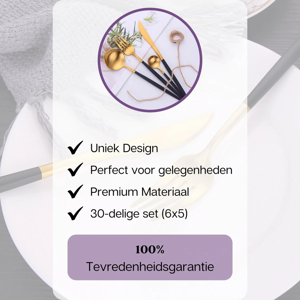 Deze exclusieve 6-delige bestek set is de nieuwste toevoeging aan de ruime collectie van LuZana. Het goud met zwarte design is afgewerkt met een matte coating die zorgt voor een hippe look. Met deze set breid jij je keukengerei collectie op een efficiënte manier uit. Door deze set hoef je namelijk niet langer op zoek naar bijpassende messen, vorken of lepels. De complete bestek set bestaat uit 30 stuks en is 6-delig: