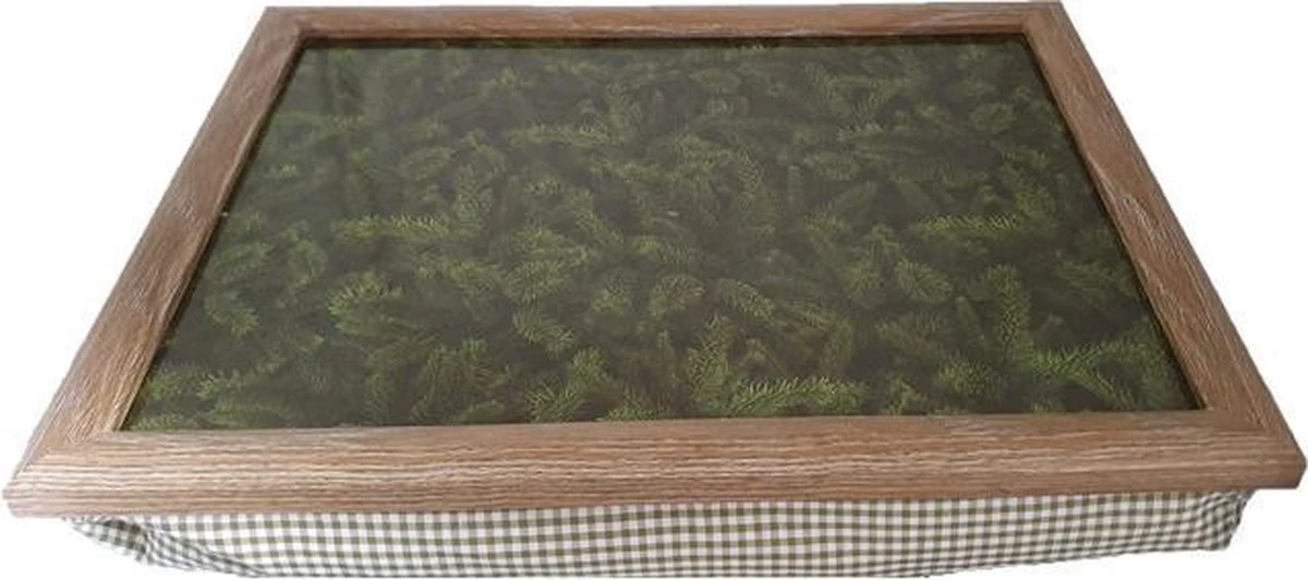 Schootkussen/laptray dennentakken print 33 x 43 cm. Gebruik de schoottafel om een laptop op te zetten, een boek te lezen of om uw bord op schoot te kunnen zetten. Onder het dienblad zit een kussen dat zich naar uw benen zal vormen waardoor het dienblad recht zal blijven staan. Formaat: 43 x 33 x 7 cm. Materiaal: MDF, katoen. Materiaal vulling: kunststof balletjes. Reinigingsinstructies: Reinigen met een licht vochtige doek. Bloemen/planten/bomen artikelen. Schoottafel/laptray woonaccessoires/woondecoraties.