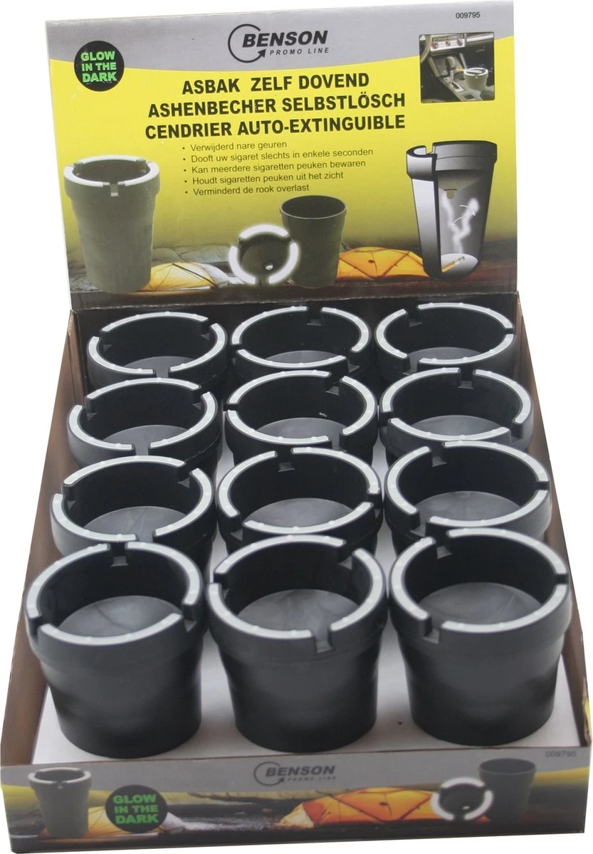 Glow in the dark auto asbak. Zwarte asbak waarbij de randjes aan de bovenkant licht geven in het donker. Bijvoorbeeld ideaal voor in de auto! Formaat: ongeveer 11 x 8 cm. Auto accessoires voor sigaretten/peuken en shaggies.