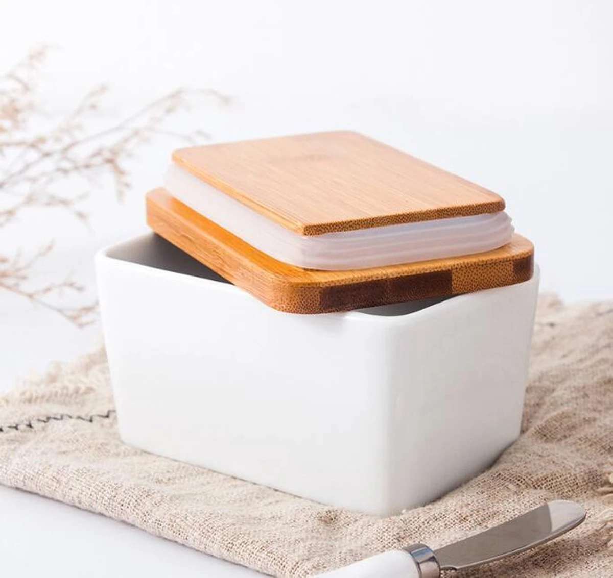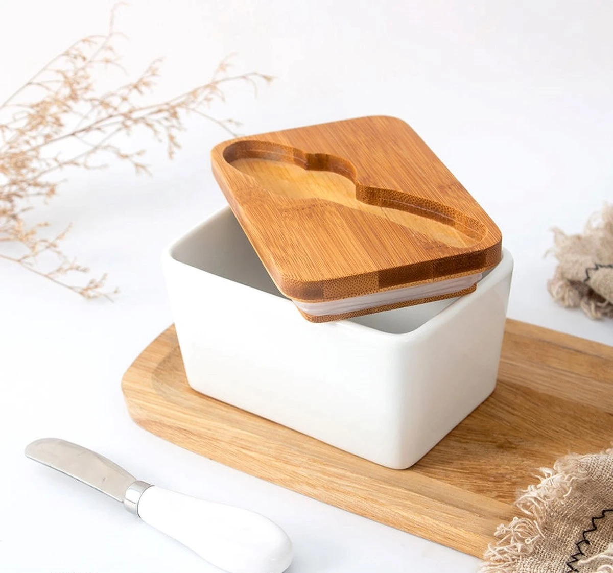- Materiaal: Porselein met bamboe deksel