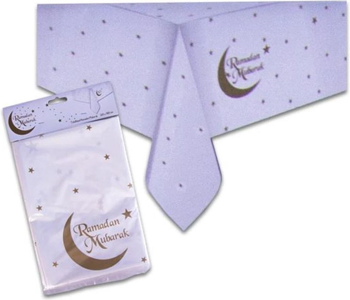Ramadan Mubarak thema tafellaken/tafelkleed 120 x 180 cm rechthoekig herbruikbaar. Offerfeest/Suikerfeest wit themakleed met in het goud de Islamitische groet Ramadan Mubarak. Het tafelzeil is gemaakt van kunststof waardoor deze afneembaar en dus herbruikbaar is. Materiaal: plastic/kunststof. Formaat: 120 x 180 cm. Ramadanfeest Eid Mubarak tafel versieringen/decoraties.