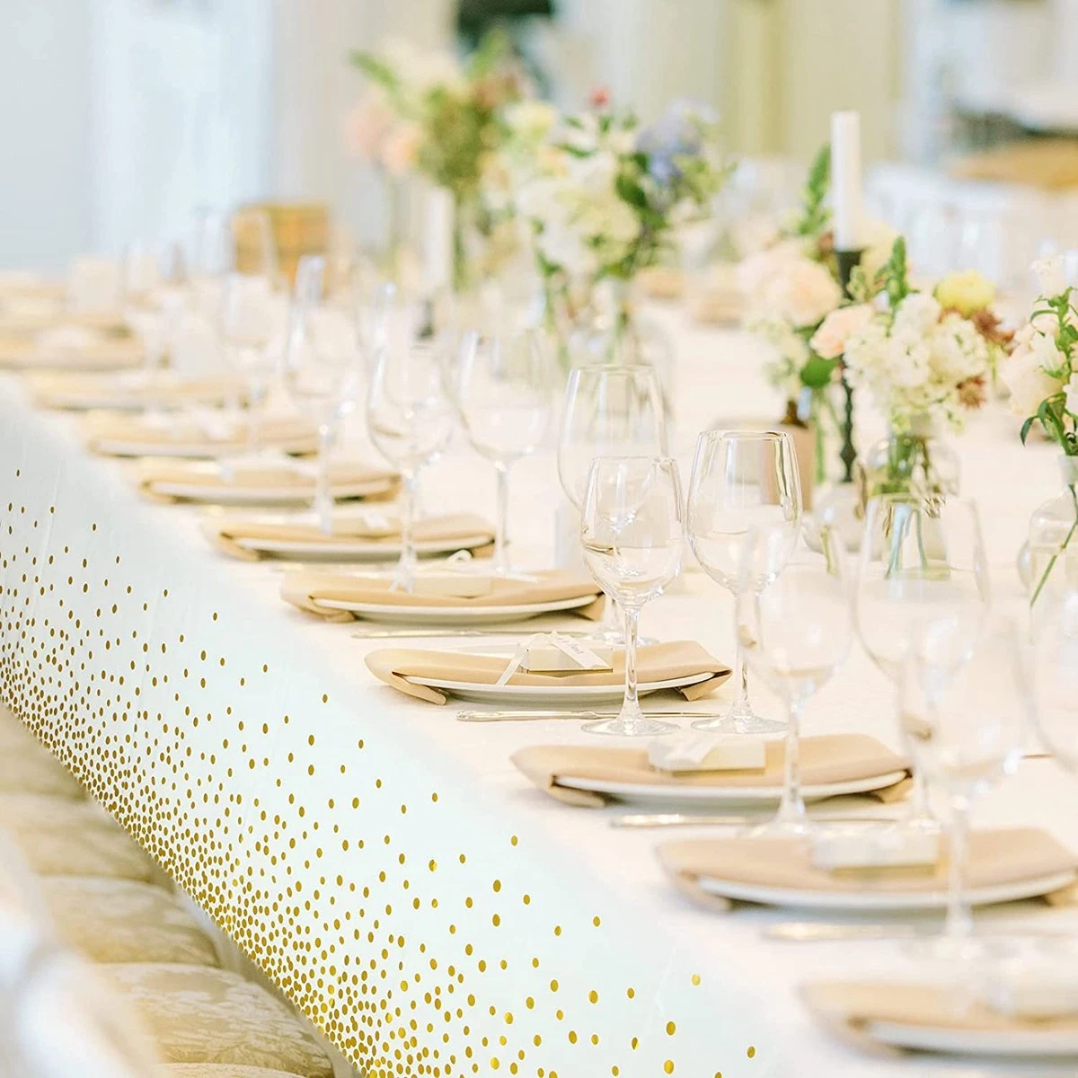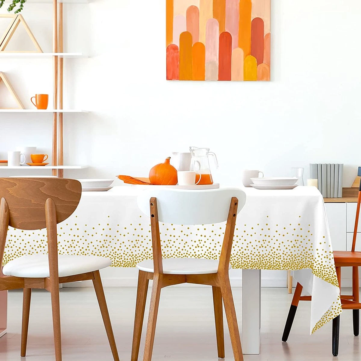 Dit tafelkleed is gemaakt van plastic, is eenvoudig schoon te maken en moeilijk te beschadigen. Het tafelkleed is wit van kleur en beschikt over gouden stippen, waardoor het uitermate geschikt is voor diverse feesten, zoals kerst, Oud en Nieuw, Valentijnsdag, Vaderdag, Moederdag, Pasen of een bruiloft. Het tafelkleed is ongeveer 274 x 137 cm groot en is hiermee geschikt voor bijna iedere tafel. Dit tafelzeil is van hoge kwaliteit, waterproef en herbruikbaar, maar ook is het mogelijk om het laken na 1 keer weg te werpen.