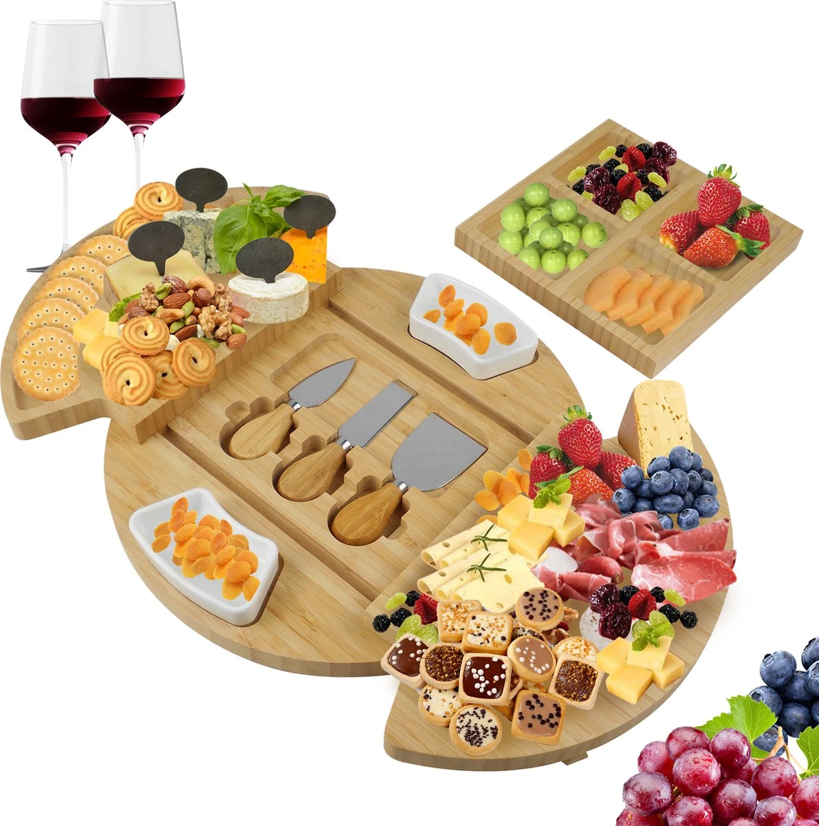 Compact – De verschillende plateaus zijn eenvoudig in elkaar te schuiven na gebruik. Dit zorgt ervoor dat jij de borrelplank makkelijk opbergt.