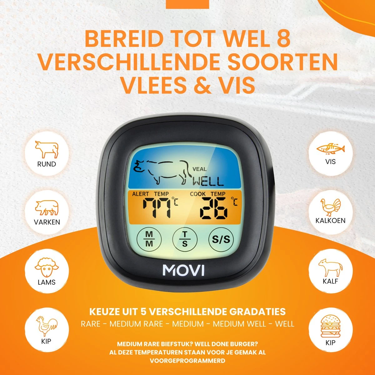 Herken jij dat ook, een heel mooi stuk vlees bij de slager gehaald om vervolgens te bereiden op de BBQ.. Maar wanneer is deze nou gaar of bereikt deze de gewenste gradatie? Wanneer is jouw stuk “Medium Rare” en die van de ander “Well Done”? Met behulp van deze vleesthermometer bereid jij altijd vlees zoals dat bedoeld is met de gewenste bite!