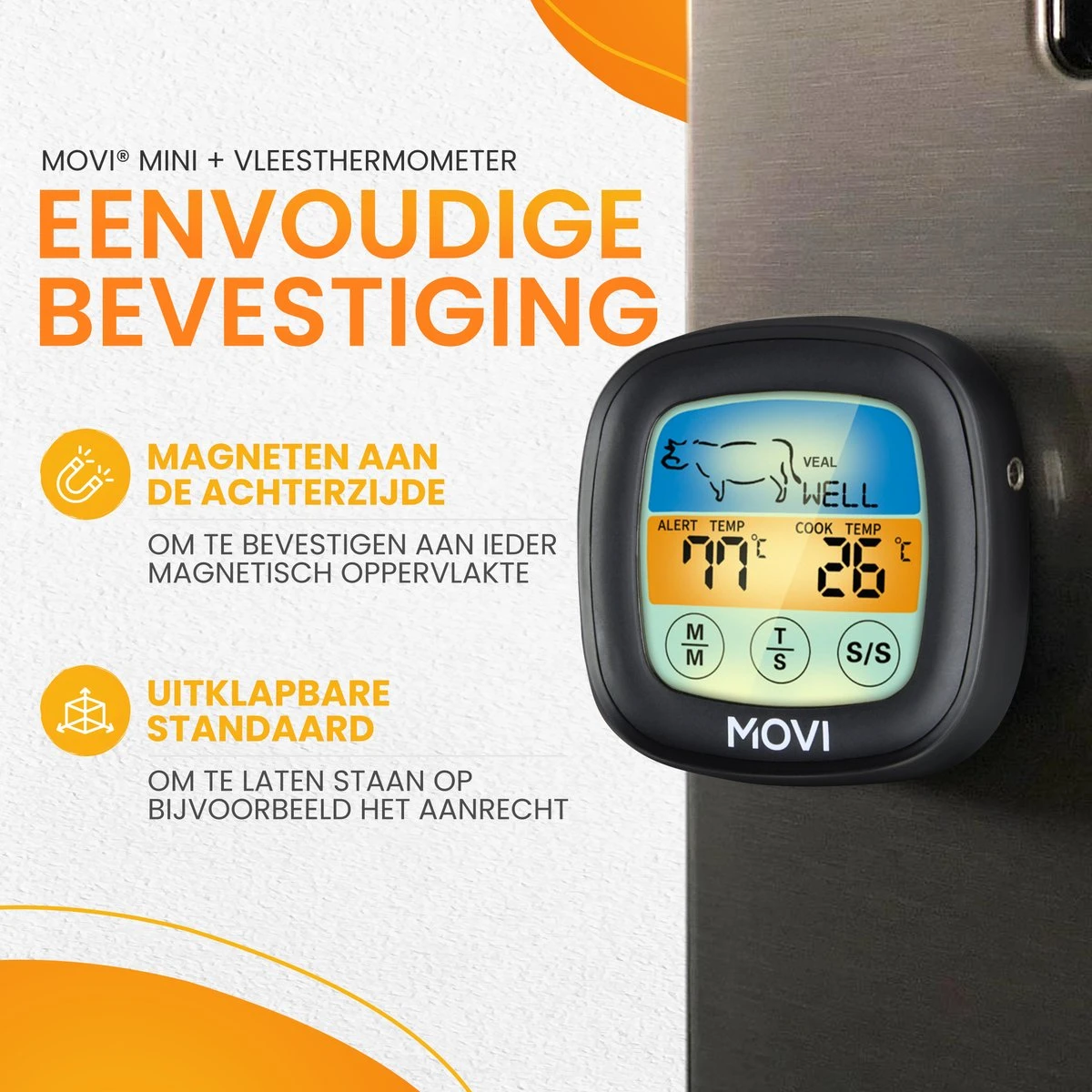 De MINI + vleesthermometer is jouw assistent in de keuken. Het kan ook worden gebruikt om de temperatuur van vloeistoffen als suiker of babyvoeding op te meten. Daarnaast kan deze eenvoudig worden ingezet als kookwekker en is daarom een onmisbare item voor iedere chef en is ideaal voor de BBQ, oven, smoker, grill en Kamado.