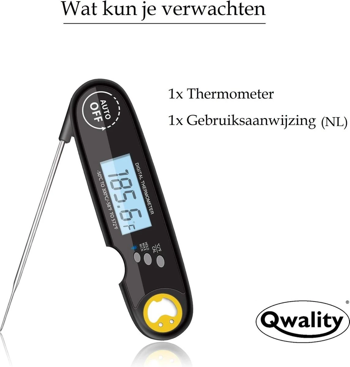 Wil jij de gerechten waar je veel tijd aan hebt besteed met volle overtuiging serveren? Kies dan voor deze keuken thermometer van Qwality. Ook ideaal om te gebruiken als Barbecue thermometer.