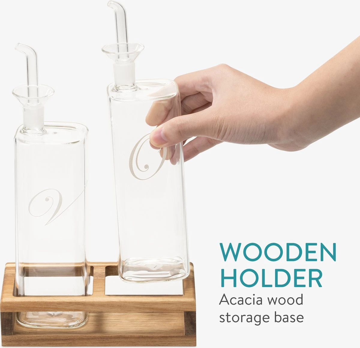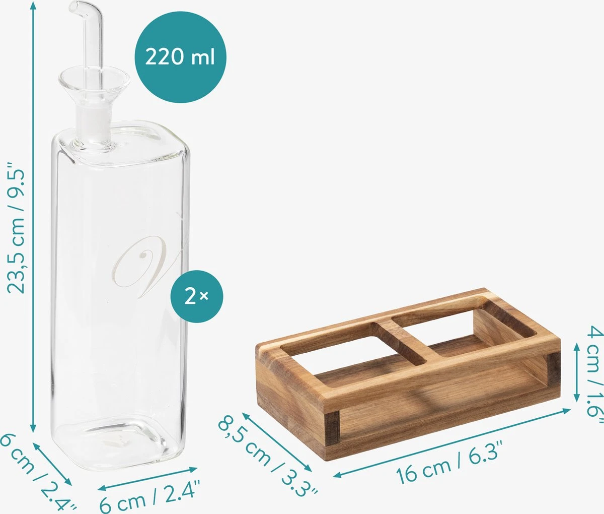 - DETAILS: Je ontvangt twee glazen flessen met schenktuit, die elk een inhoud van 440 ml hebben, en een houten houder.