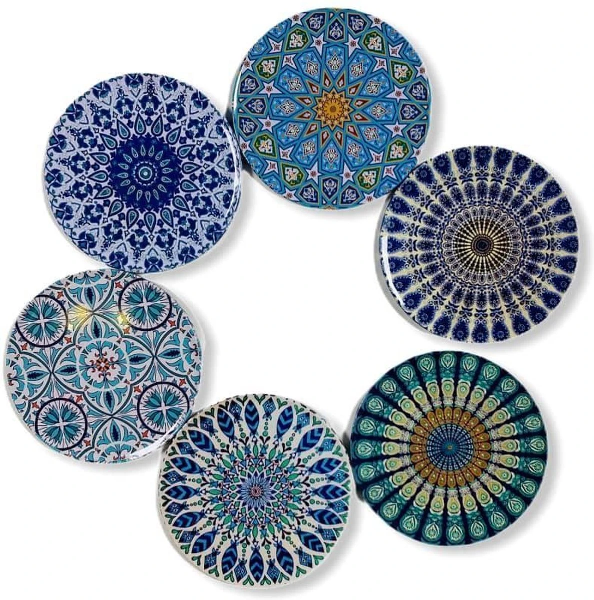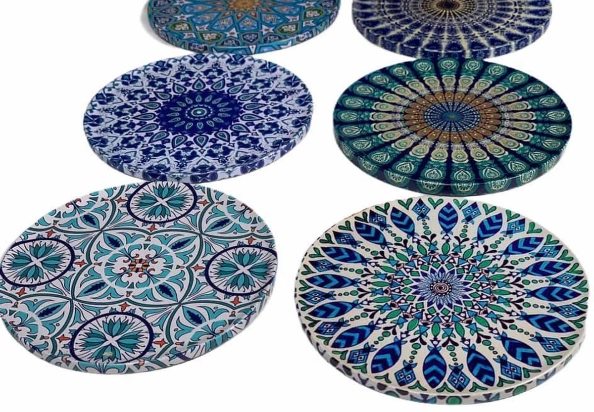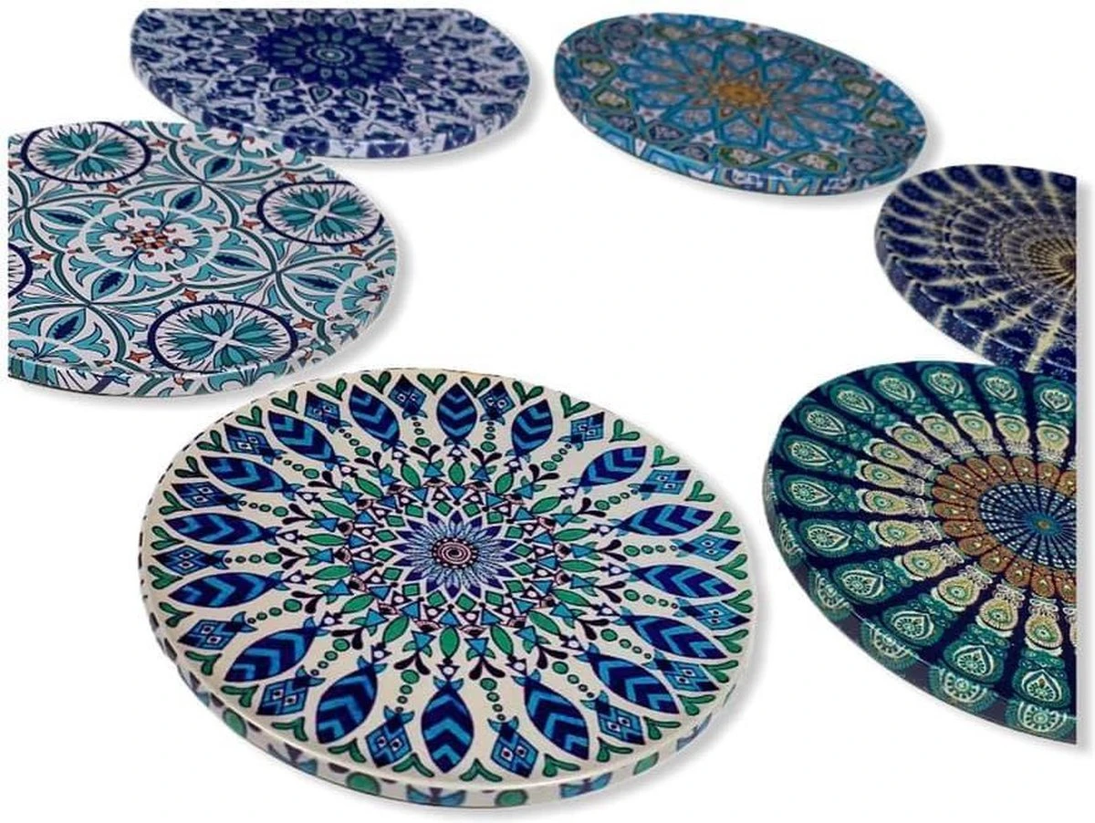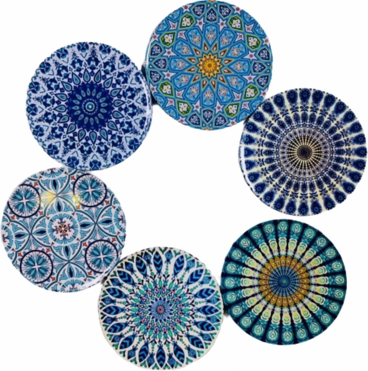 Deze set bestaat uit 6 verschillende design coasters. Deze zijn in Bohemian, Oriental en Mandala designs. Onderzetters zijn van 9 cm diameter en 3 mm dikte.