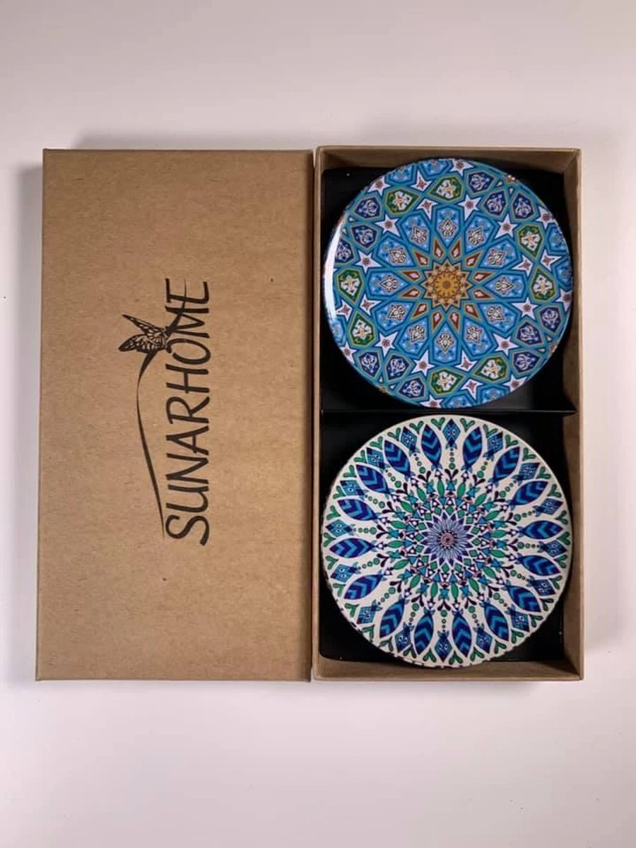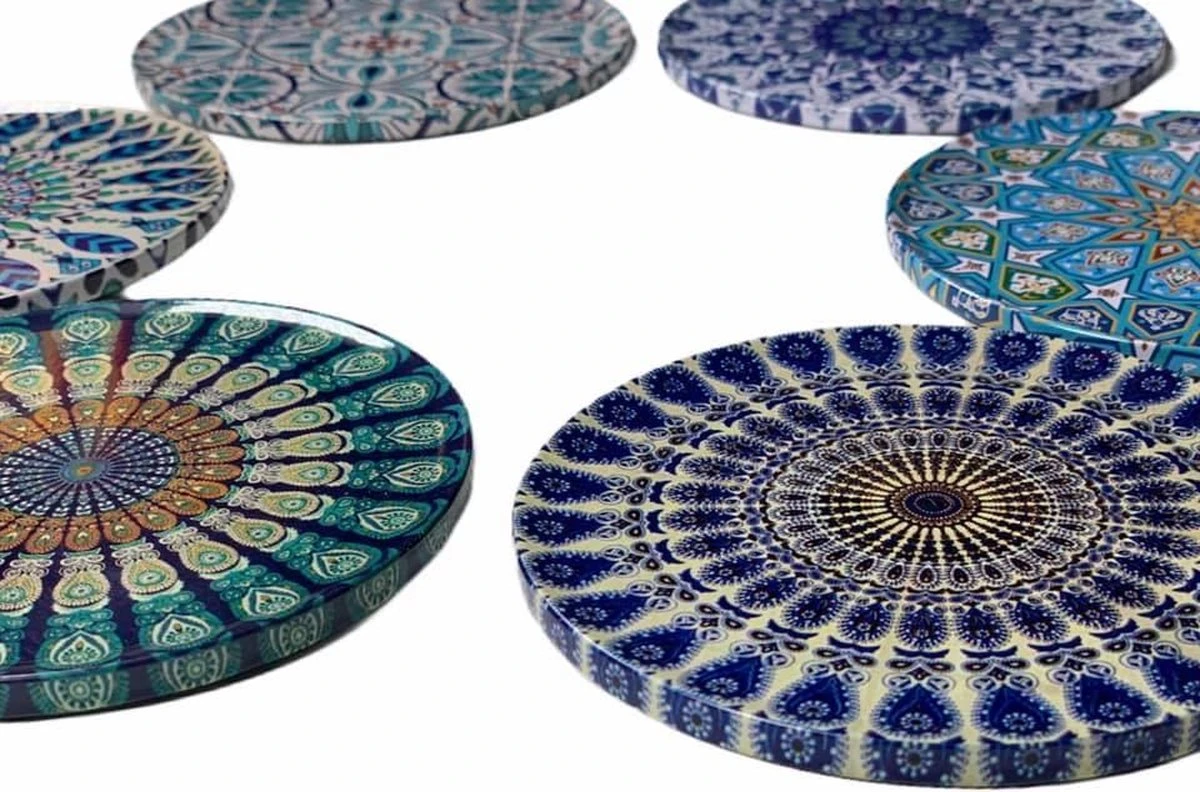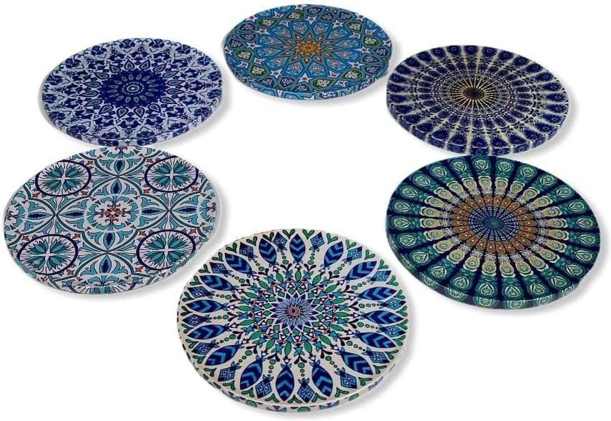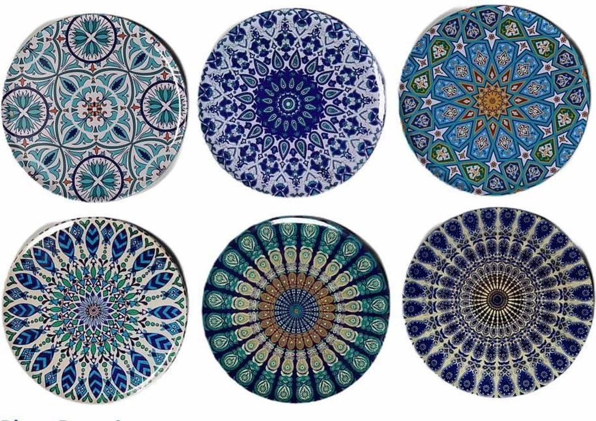 Deze set bestaat uit 6 verschillende design coasters. Deze zijn in Bohemian, Oriental en Mandala designs. Onderzetters zijn van 9 cm diameter en 3 mm dikte.