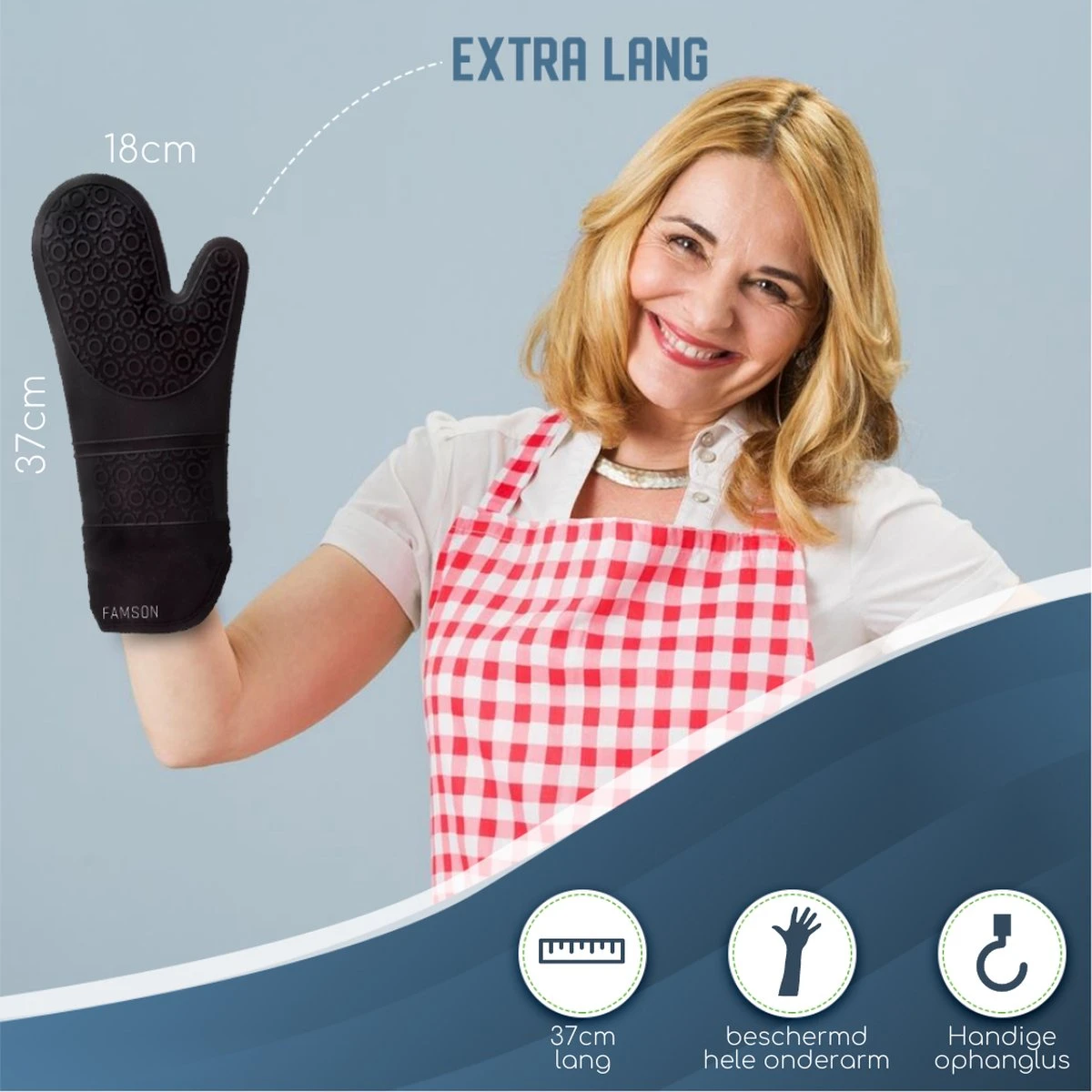 De ovenwanten van Famson zijn lange handschoenen en is dus passend voor iedereen. rechts maar óók linkshandige!