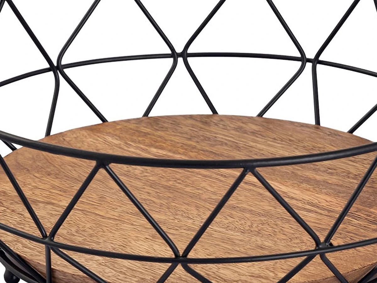 Fruitschaal met de hand gevormd uit metaaldraad met hoogwaardige afwerking en massief mangohout gelakt onderstel
