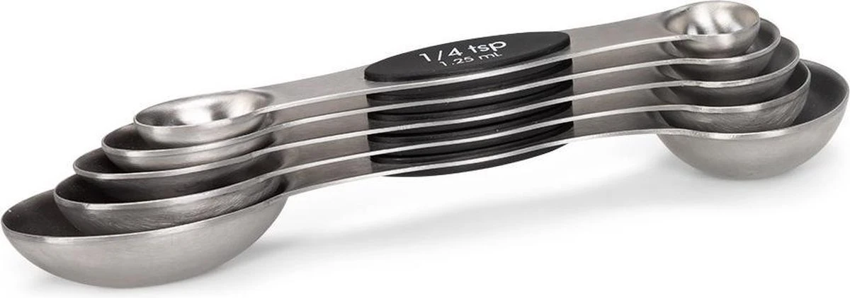 Deze vijf maatlepels zijn superhandig in gebruik en makkelijk bij elkaar te houden dankzij de magnetische werking! Ze hebben vijf verschillende maten, van groot naar klein: 15 ml (1 eetlepel) – 7,5 ml (1/2 eetlepel) – 5 ml (1 theelepel) – 2,5 ml – 1,25 ml (1/4 theelepel).