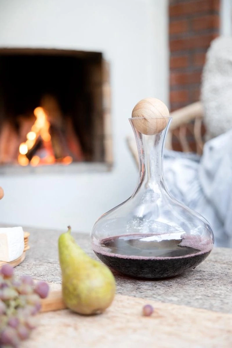 Met het ontkurken van de wijn, komt er helaas niet genoeg zuurstof bij de wijn. Door het overgieten van de wijn in een decanteerkaraf komt er extra zuurstof bij de wijn. Hierdoor kan de smaak van de wijn beter ontwikkelen. Naast het feit dat u de wijn extra lucht geeft, staat het ook nog eens netjes op tafel. De eikenhouten stop geeft een leuk tintje aan het geheel.