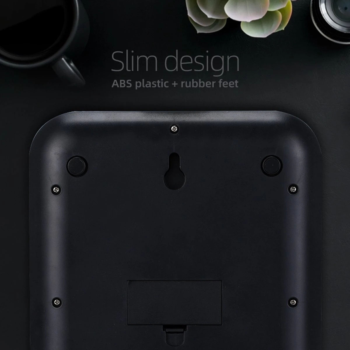 Op de achterkant bevinden zich anti-slip hoekjes zodat de weegschaal altijd stabiel en stevig blijft staan op het aanrecht. De weegschaal is gemaakt van roestvrijstaal en neemt niet veel plek in, bovendien kan deze ook worden opgehangen aan een haakje in de keuken. Eenvoudig en praktisch in gebruik, een aanwinst voor elke keuken.