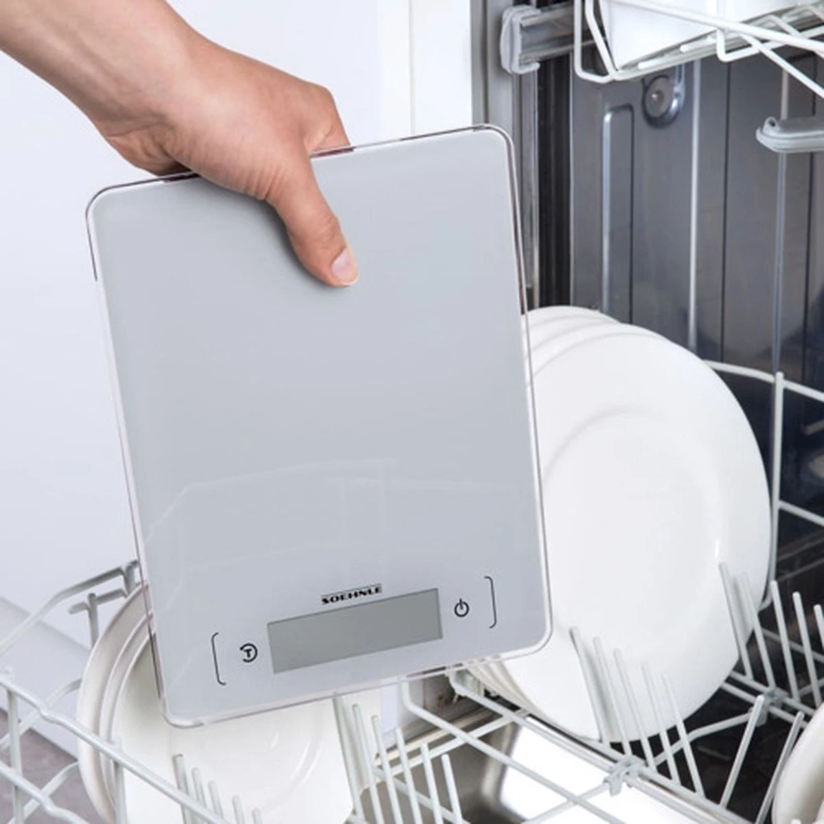 De digitale keukenweegschaal Page Aqua Proof heeft een waterdichte behuizing met TÜV-keurmerk en kan probleemloos in de vaatwasser. Of je kunt de weegschaal even schoonspoelen onder de kraan. Terwijl de hoogwaardige elektronica binnenin goed beschermd is, worden vlekken, vieze vingerafdrukken en meelresten grondig verwijderd in de vaatwasser of onder de kraan. Resultaat: een weegschaal die weer helemaal schoon is, van de voetjes tot het display.