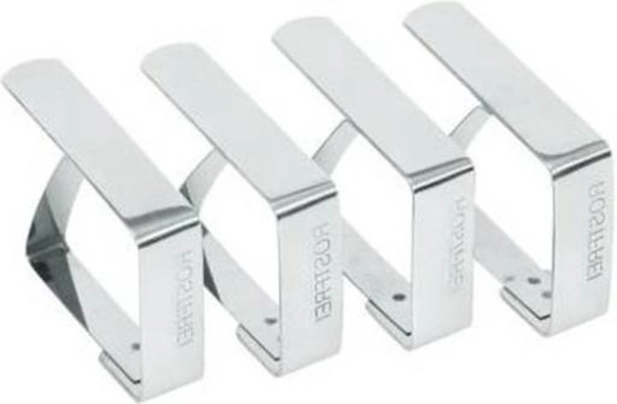 Een set van 4x klemmen van roestvrijstaal. Handig om een tafelkleed vast te klemmen aan een tafel. Afmeting ca: 4 x 5 x 1.2 cm. Materiaal: RVS.