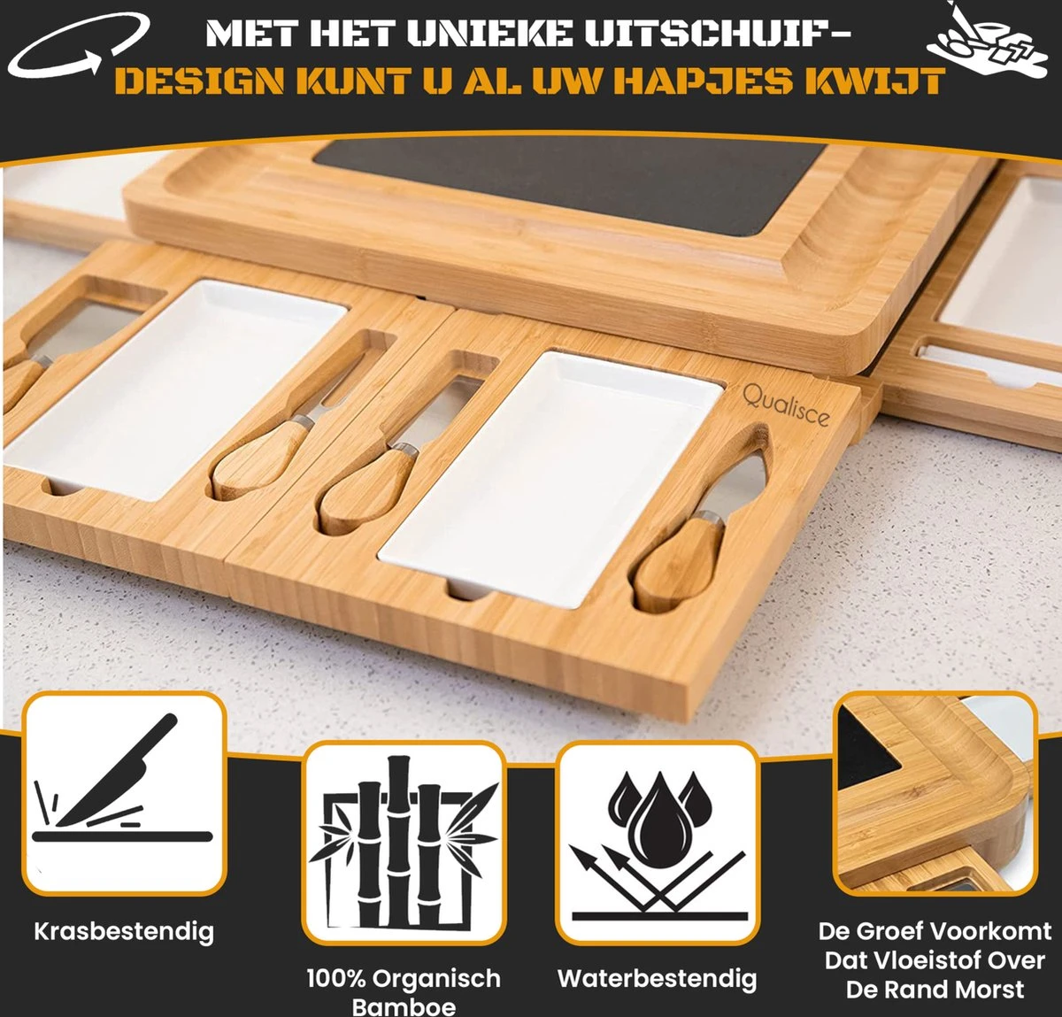 Compact design: De plank beschikt over een vierkant plateau met daarin aan beide zijdes een lade met diverse kaasmesjes. Het design ziet er strak uit en is daarnaast erg functioneel. U kunt de lades eenvoudig in de tapasplank schuiven.