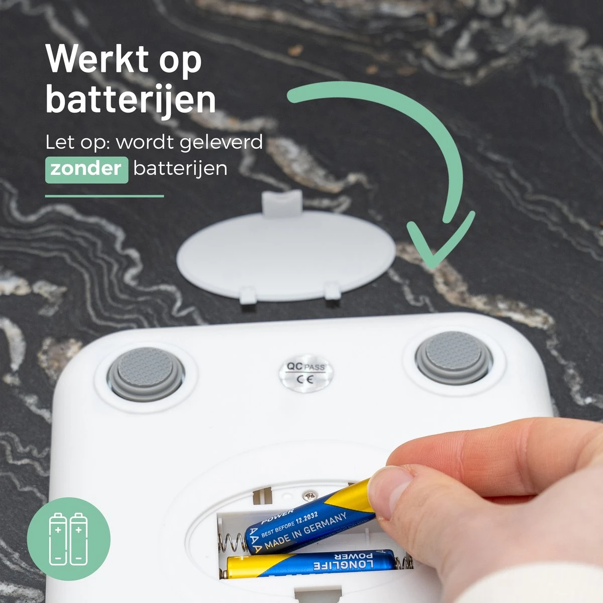 Let op: De keukenweegschaal wordt geleverd ZONDER batterijen.