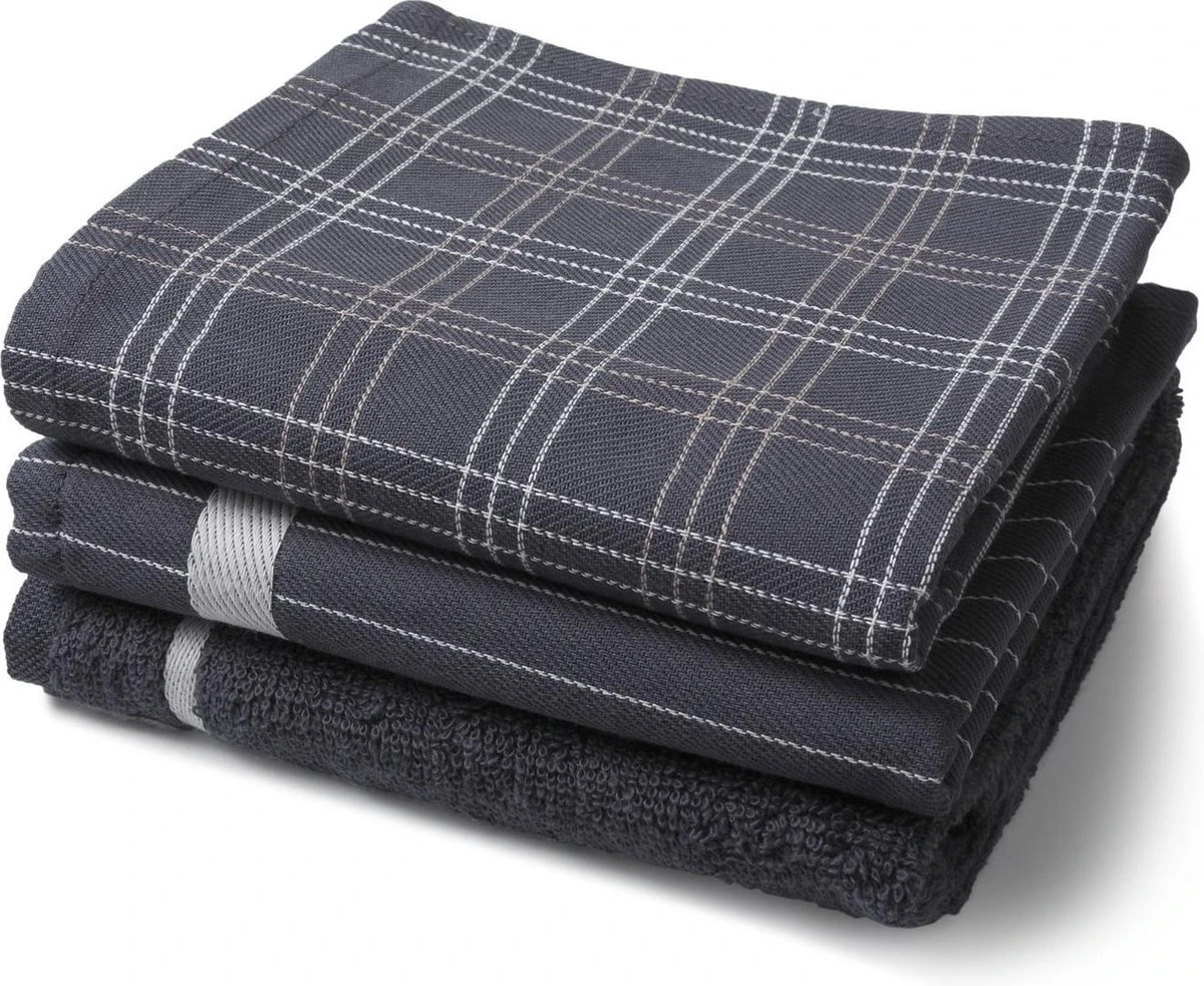 Twentse Damast Keuken Handdoeken Mix&Match – Katoen – Keukendoeken En Theedoeken Set – 3 Stuks – Antraciet